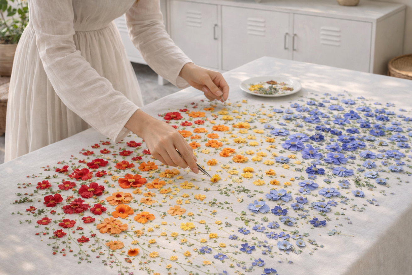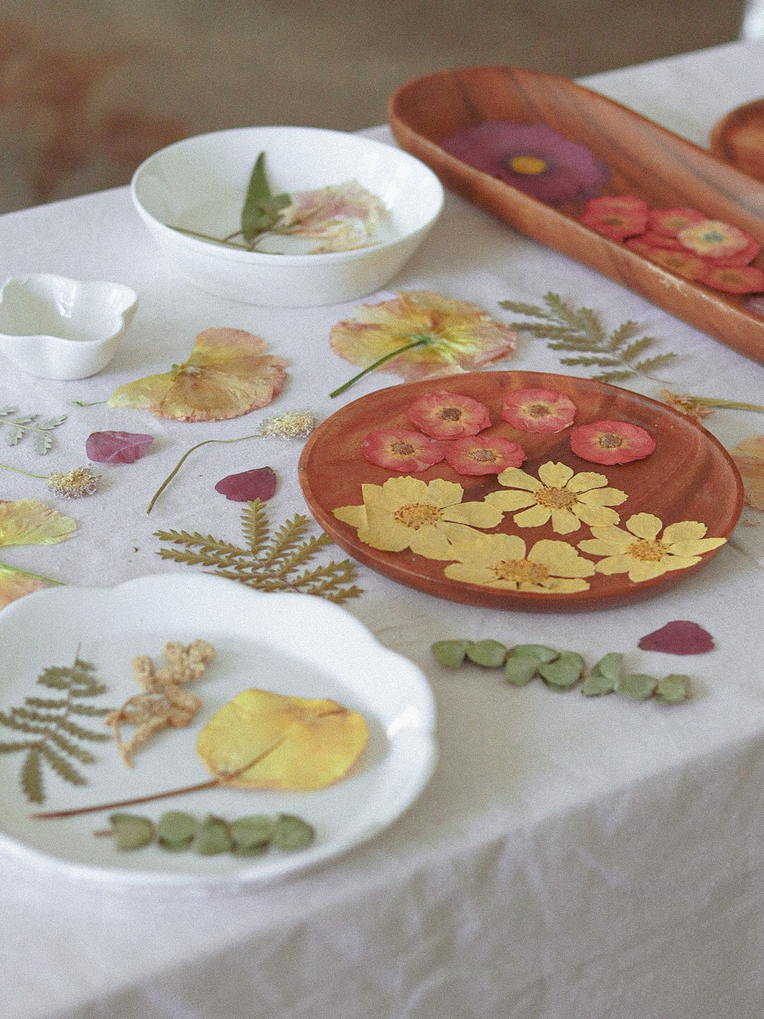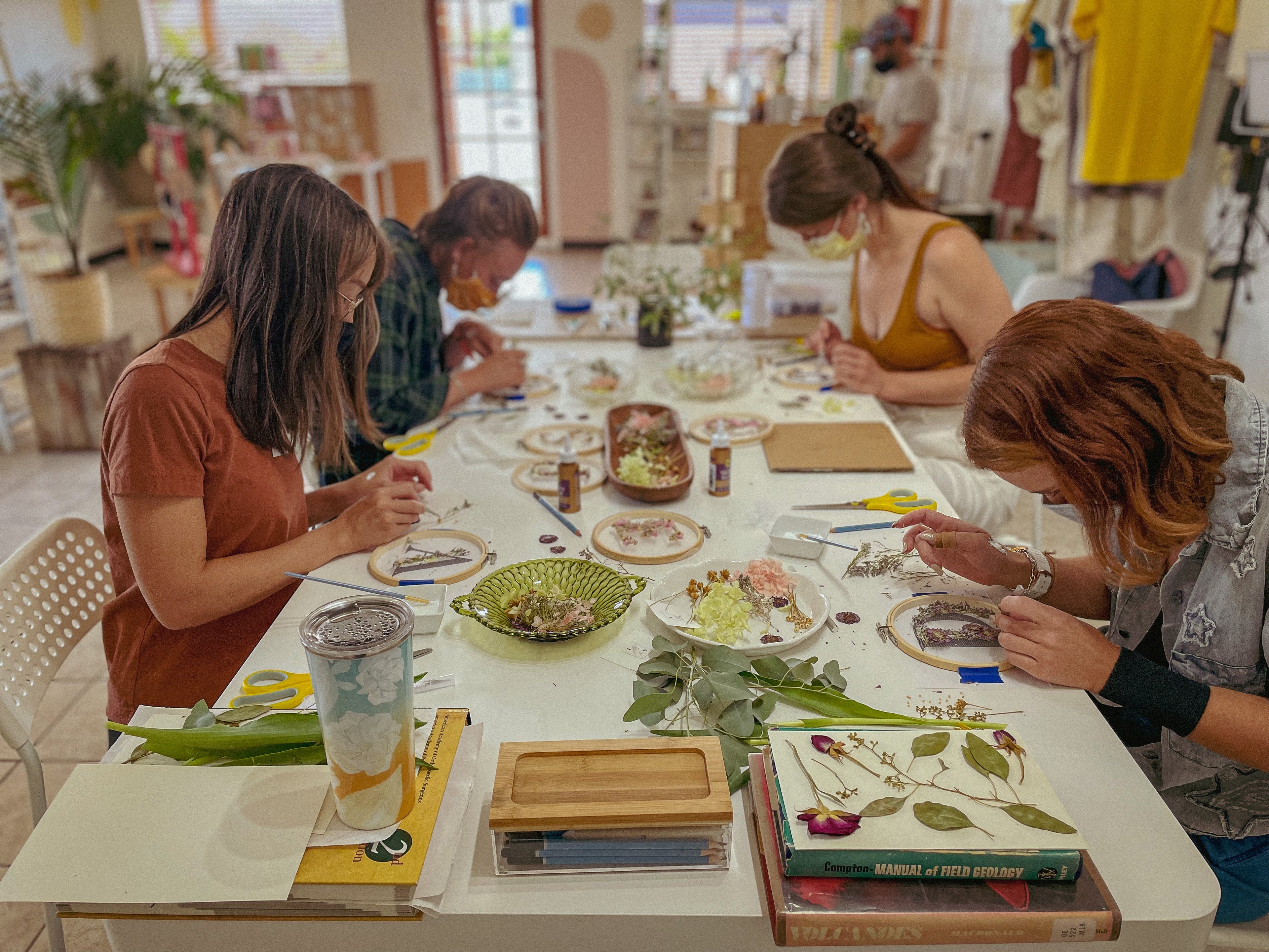 Pressed-flower art jamming is a floral art session inspired by Oshibana (押し花), the 16th-century Japanese art of creating compositions using pressed flowers and botanical materials.