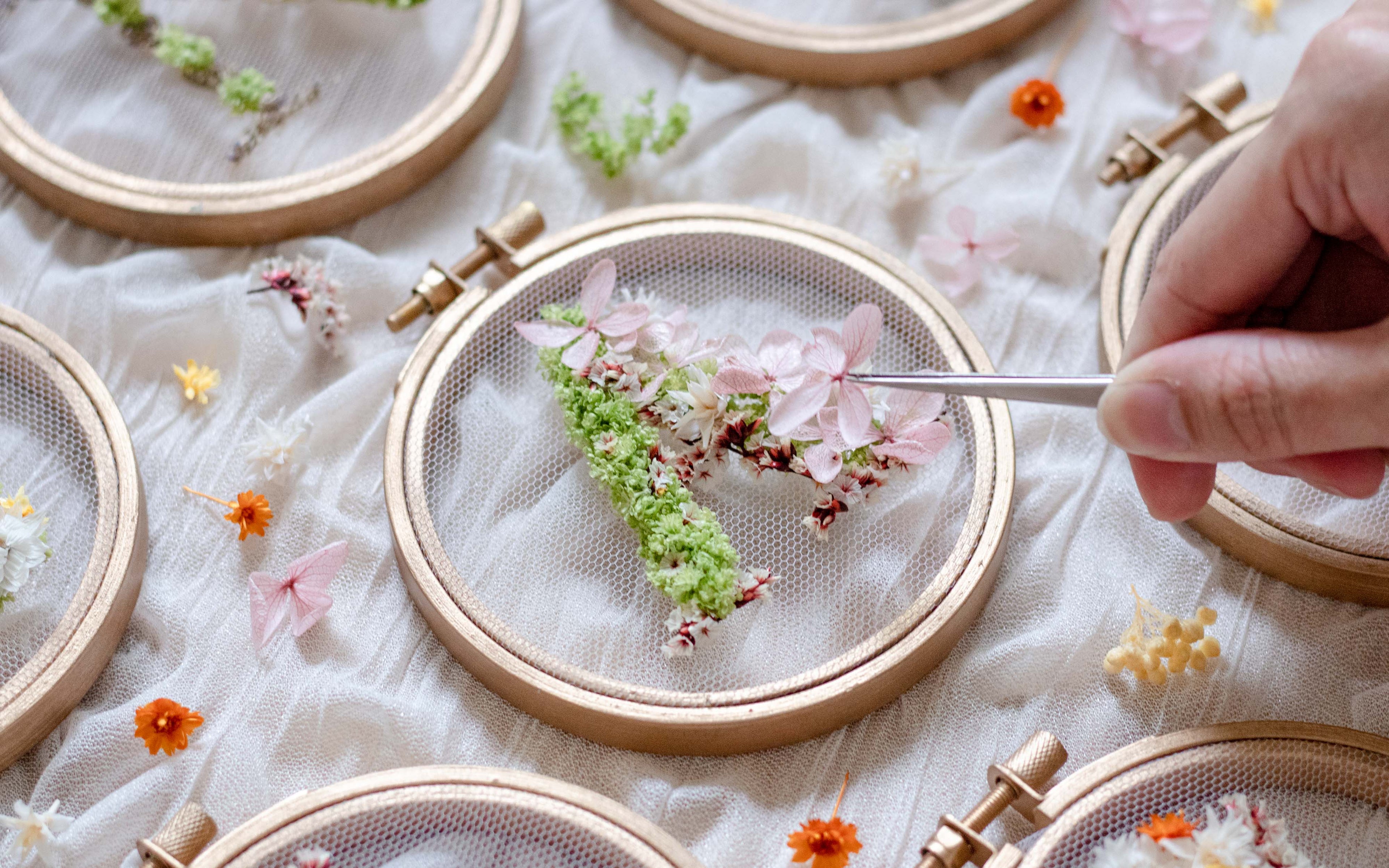 Each bloom is carefully woven through delicate tulle, creating an airy, floating effect—almost as if the flowers are suspended in mid-air. This intricate process transforms dried flowers into a timeless, ethereal keepsake.