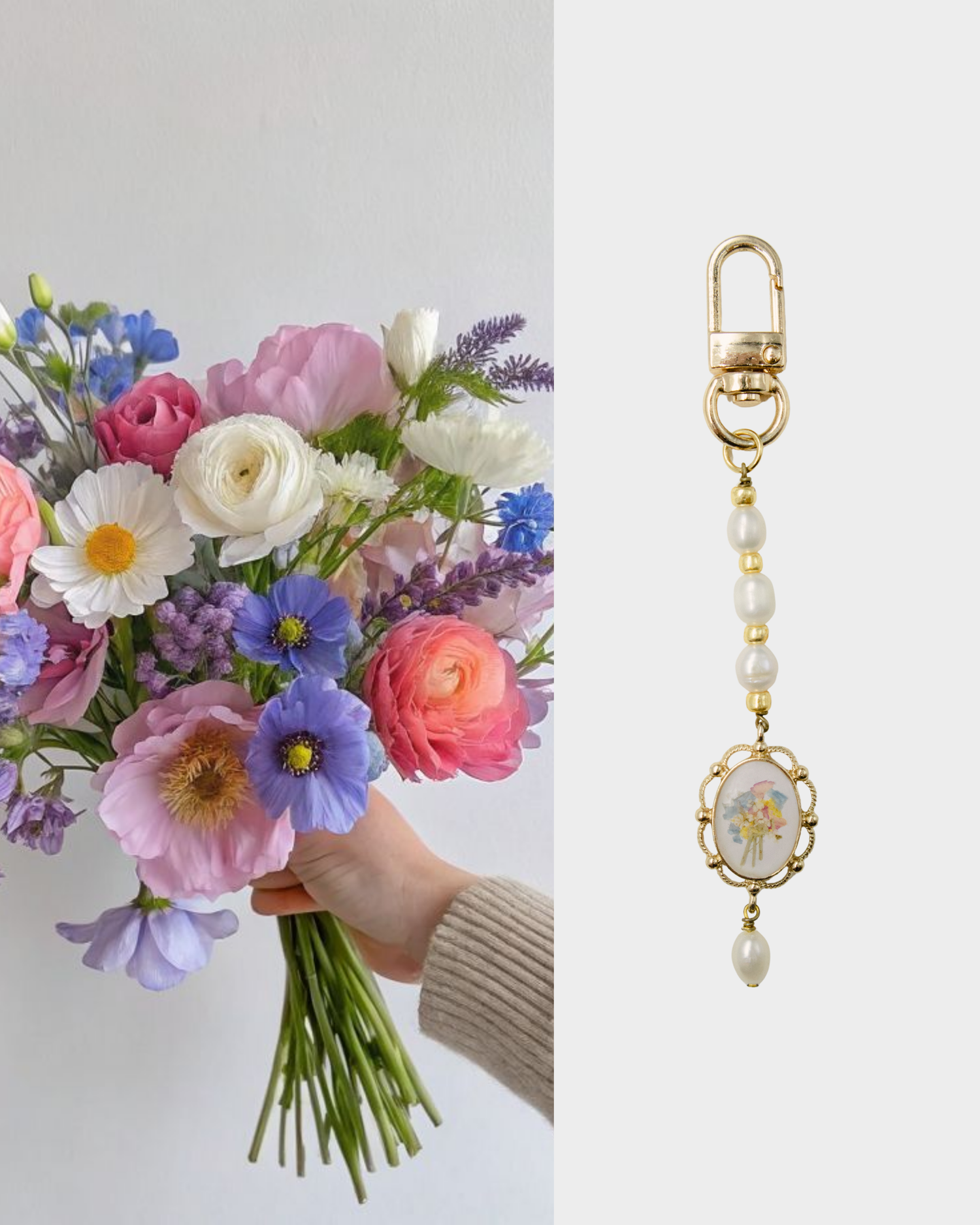 Real pressed flowers are chosen for their colour, form, and texture. Each miniature bouquet is reimagined, not as an exact replica, but as a poetic interpretation that preserves the soul of your original arrangement.